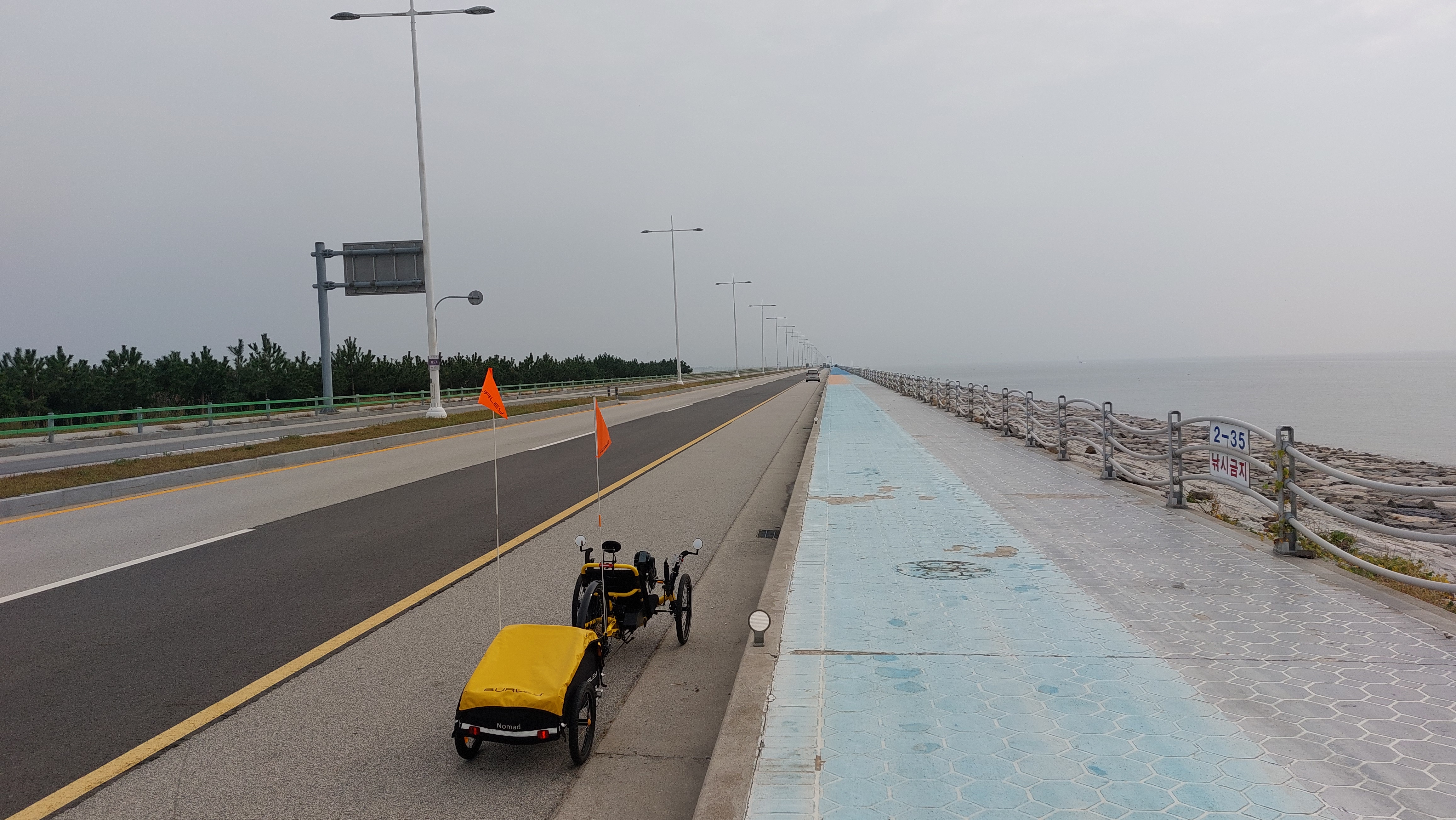 사진에서 보시다 싶이 갓길이 넓습니다. 모두 그렇지 않지만 지나다니는 차량이 많이 비켜주시고 양보해 주는 바람에 편하게 지나 갔습니다. 또한 방조제 자체가 고도가 없다보니 아주 편안한 주행이 되었습니다. 방조제는 신시도를 기준으로 위로는 군산 아래로는 변산반도와 연결되어있습니다. 신시도도 한바퀴 둘러보고 싶었지만 시간상 통과합니다.